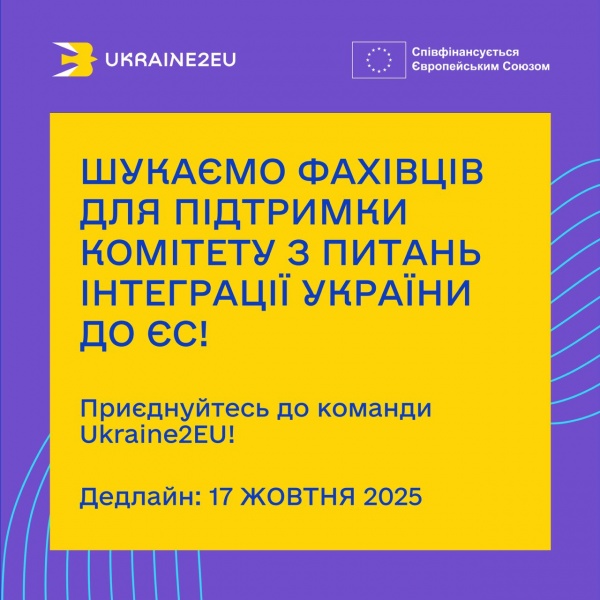 Програма Європейського Союзу Ukraine2EU, яка підтримує Україну на шляху до членства в Євросоюзі, відкрила дві вакансії, спрямовані на підсилення спроможностей Комітету з питань інтеграції України до ЄС.