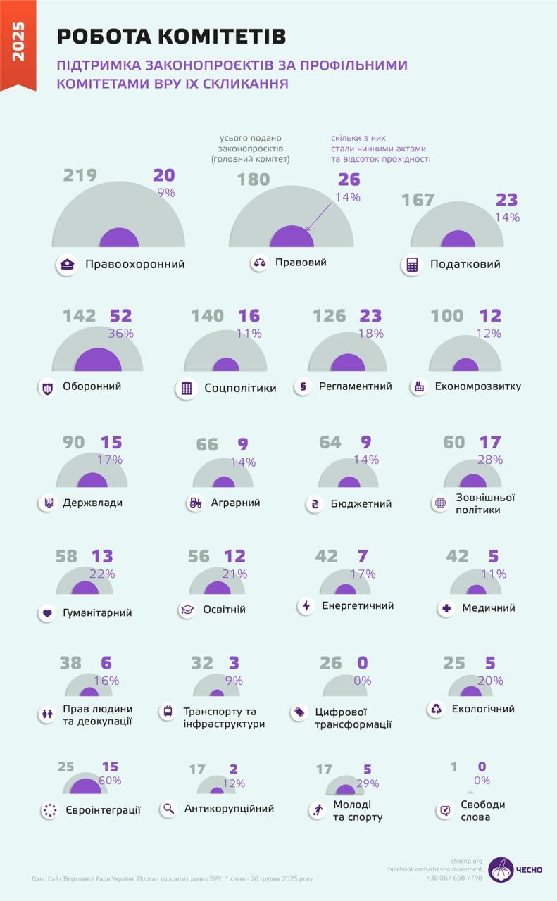 Комітет з питань інтеграції України до ЄС є лідером серед парламентських комітетів серед законопроєктів, які були ухвалені Верховною Радою. Це дані дослідження Руху Чесно про підсумки роботи парламенту, оприлюднені 30 грудня 2025 року. У дослідженні йдеться про проєкти, де Комітет було визначено головним. Таких законопроєктів було опрацьовано 25, 15 з них стали законами, що становить 60% успішності ухвалення — найвищий показник серед усіх комітетів Верховної Ради.